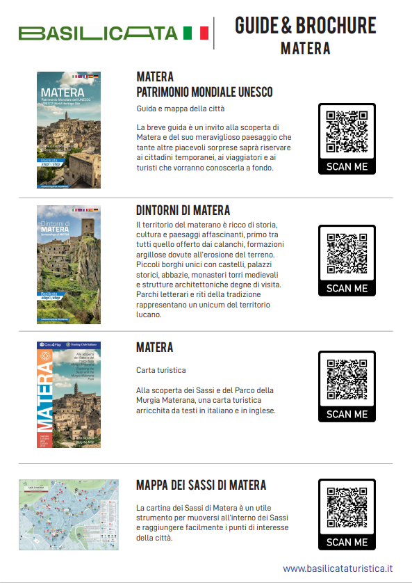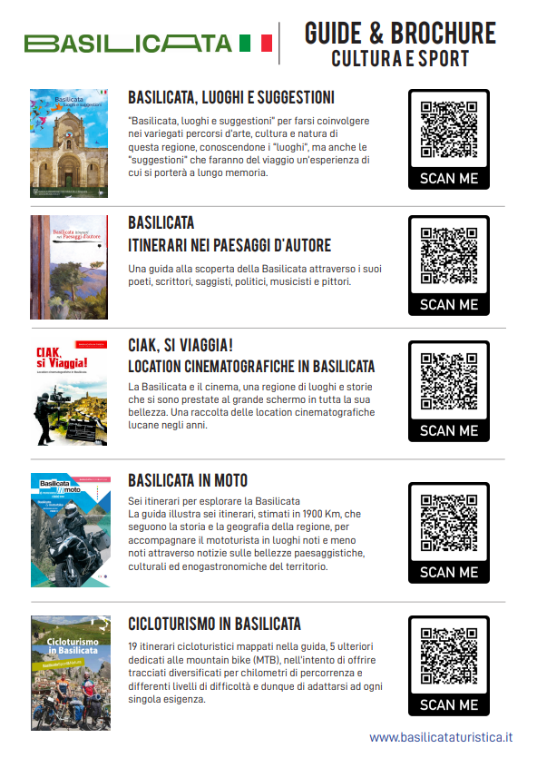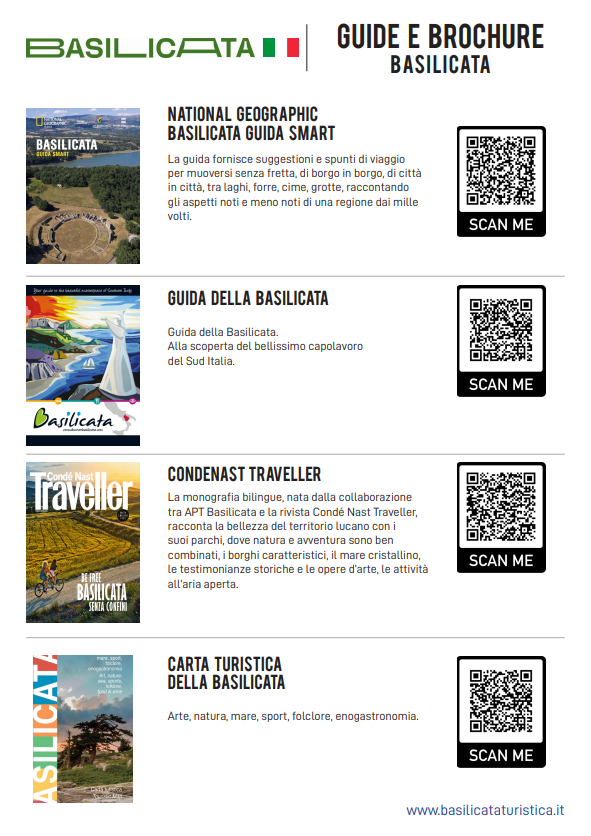 In questa pagina troverete le guide ufficiali dell’APT (Agenzia di Promozione Territoriale) della Basilicata, che potrete scaricare e consultare comodamente. All’interno della guida troverete gli itinerari e tutti i suggerimenti dei luoghi da visitare. Potrete anche rivolgervi al nostro personale che saprà consigliarvi le attrazioni da visitare.